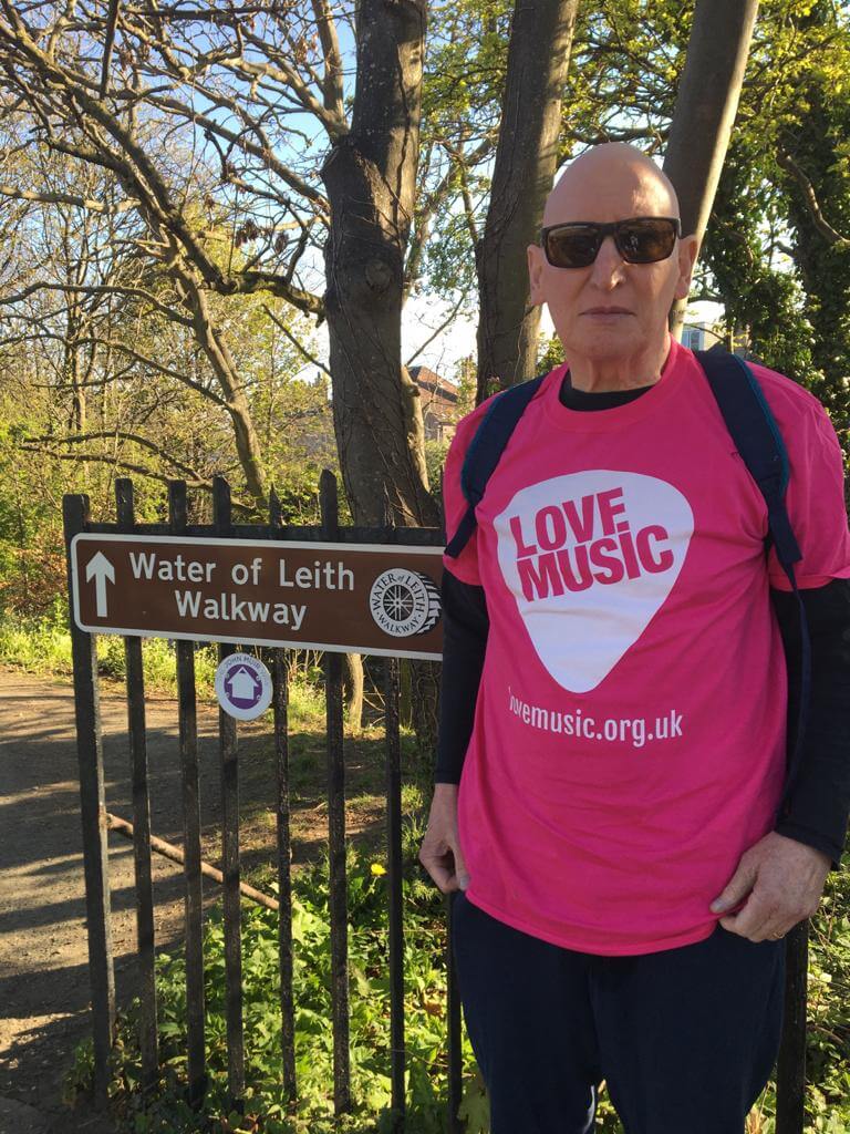 Photo of a man in sunglasses and a pink Love Music tshirt next to a sign for the Water of Leith Walkway