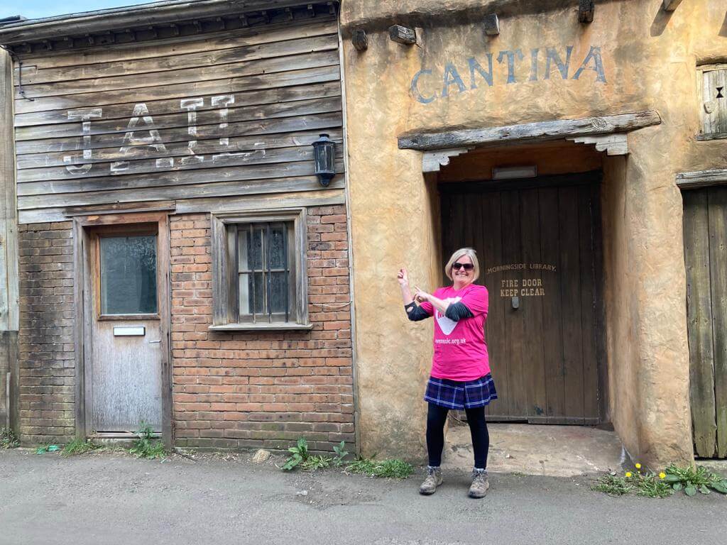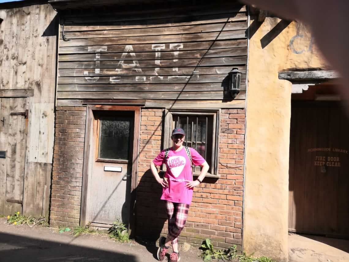 Photo of a woman in pink Love Music tshirt and kilt next to a building with a faded JAIL sign