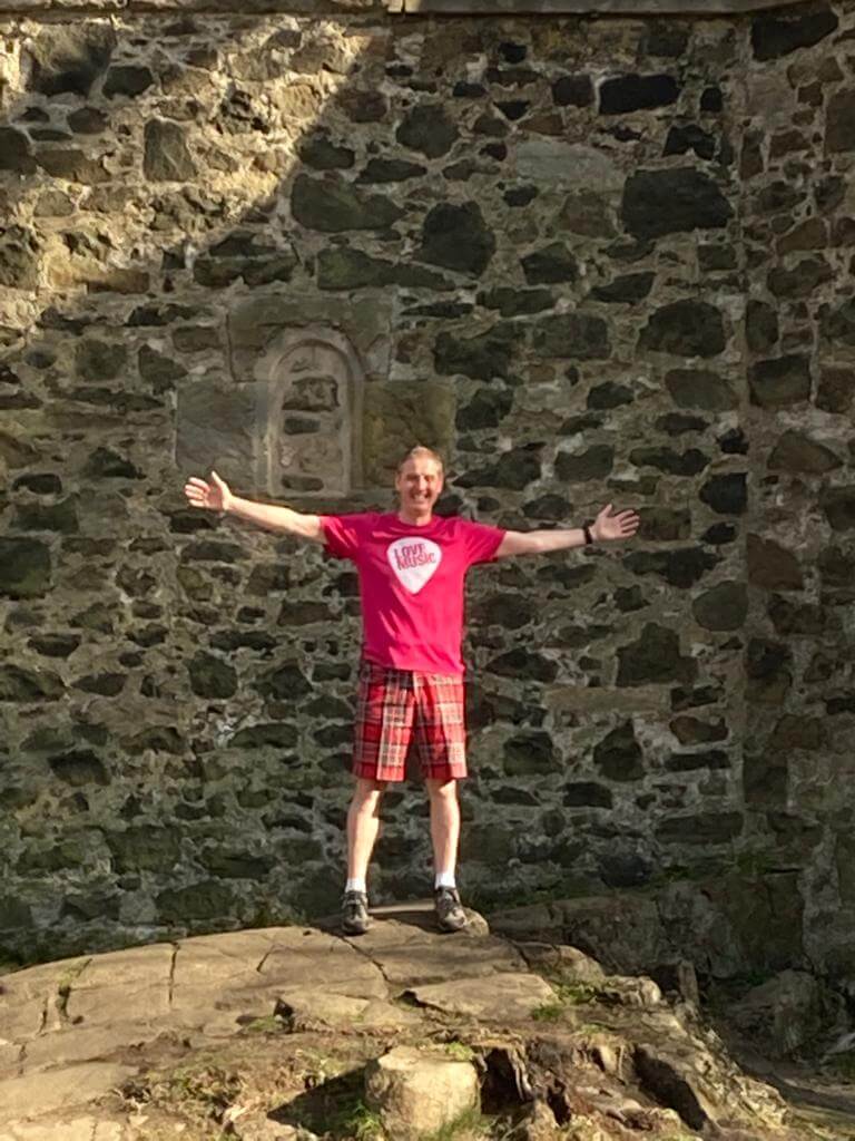 Photo of a man in pink Love Music tshirt and tartan shorts standing with arms outstretched infront of a large stone building