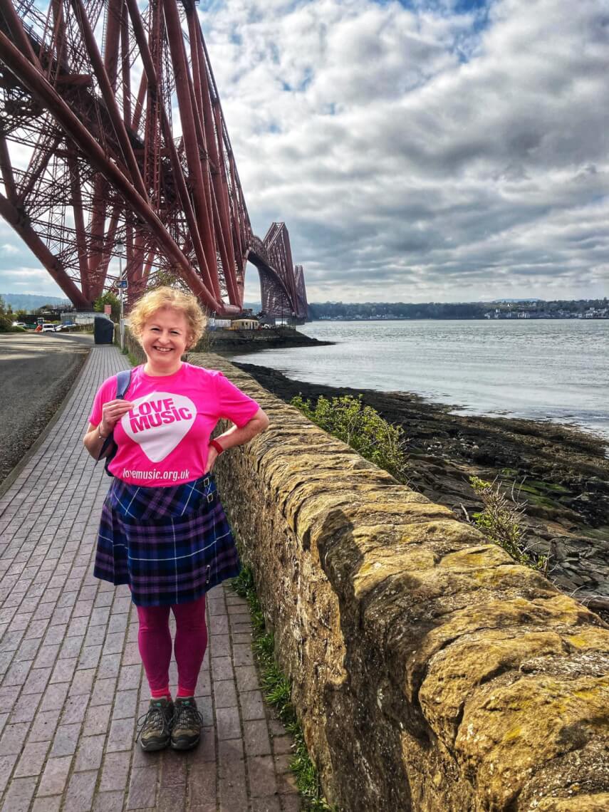 Photo of a woman in pink Love Music tshirt and kilt standing in front of the Forth Rail Bridge