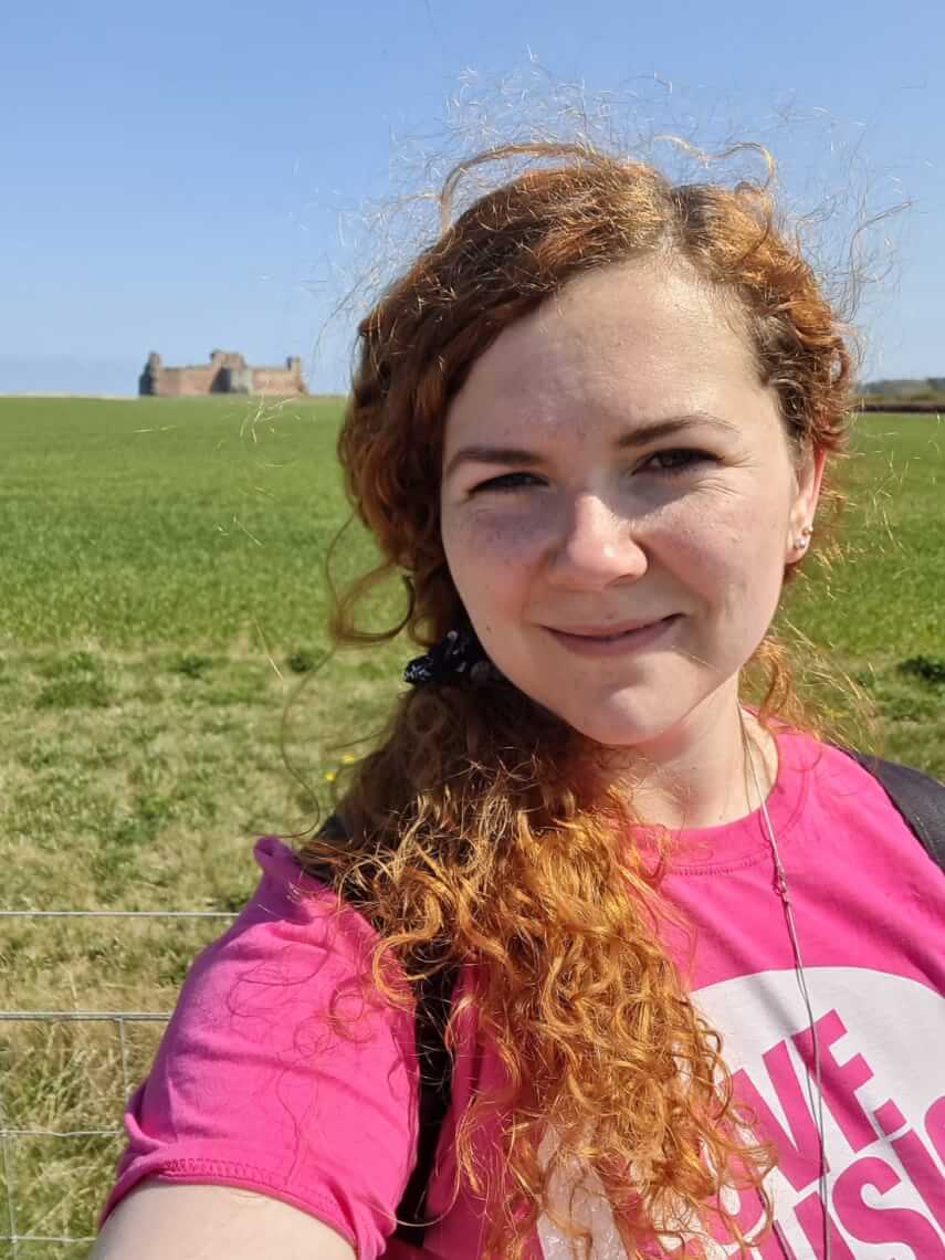 Selfie of a woman in pink tshirt with Tantallon Castle in the background