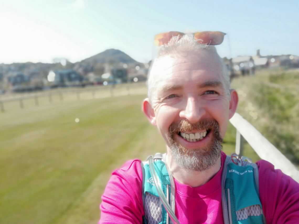 Selfie of a man in pink tshirt with the Berwick Law behind him