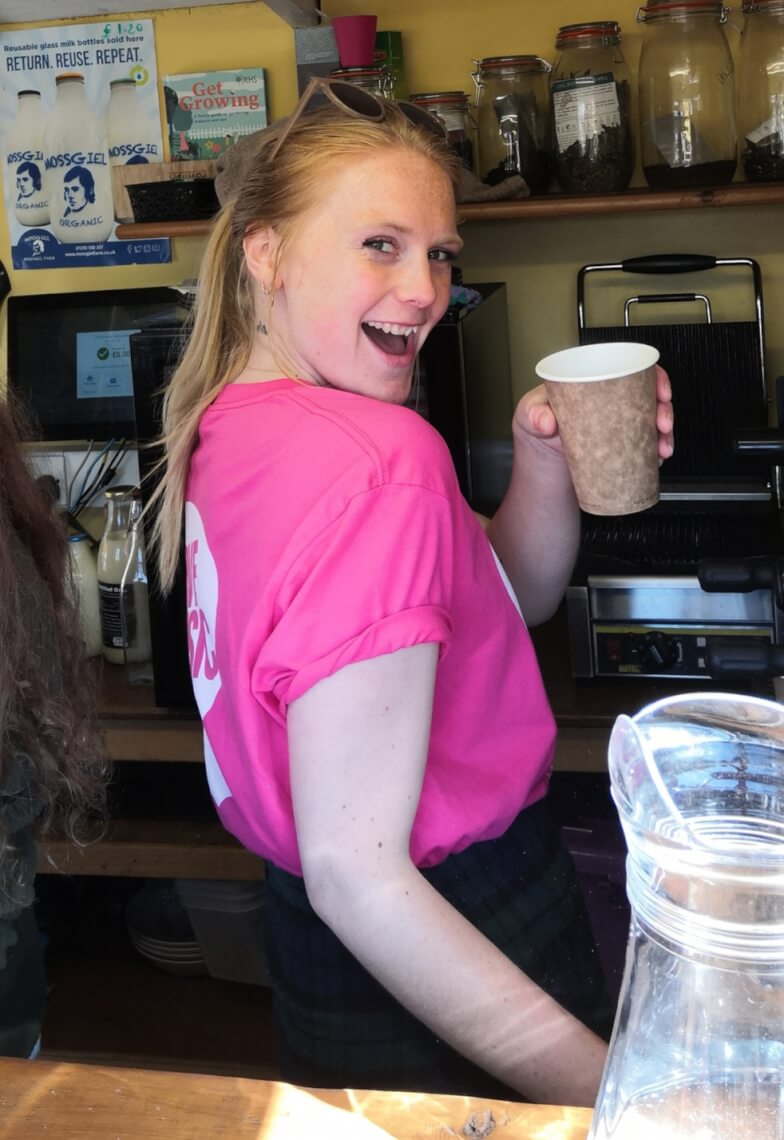 Photo of a woman in pink tshirt holding a coffee cup next to coffee making equipment